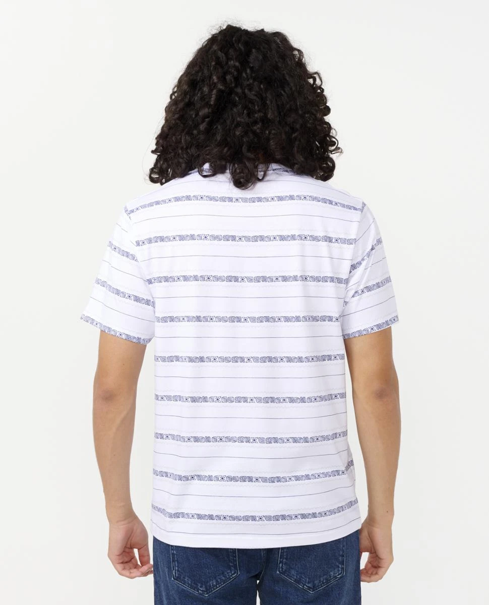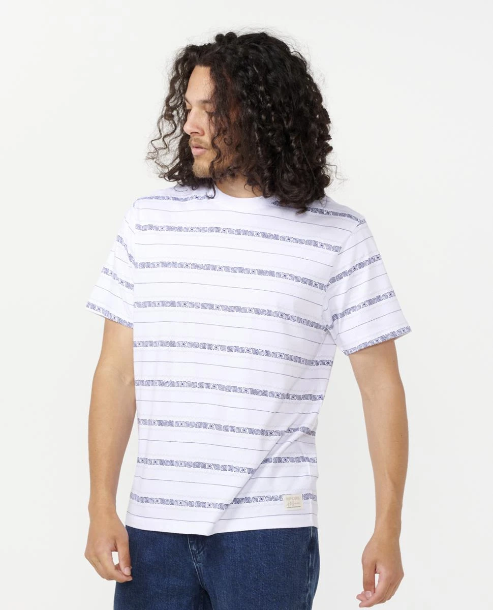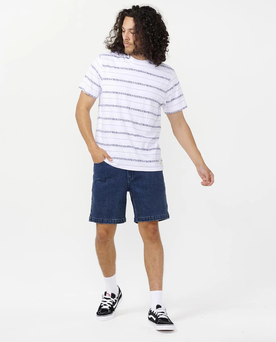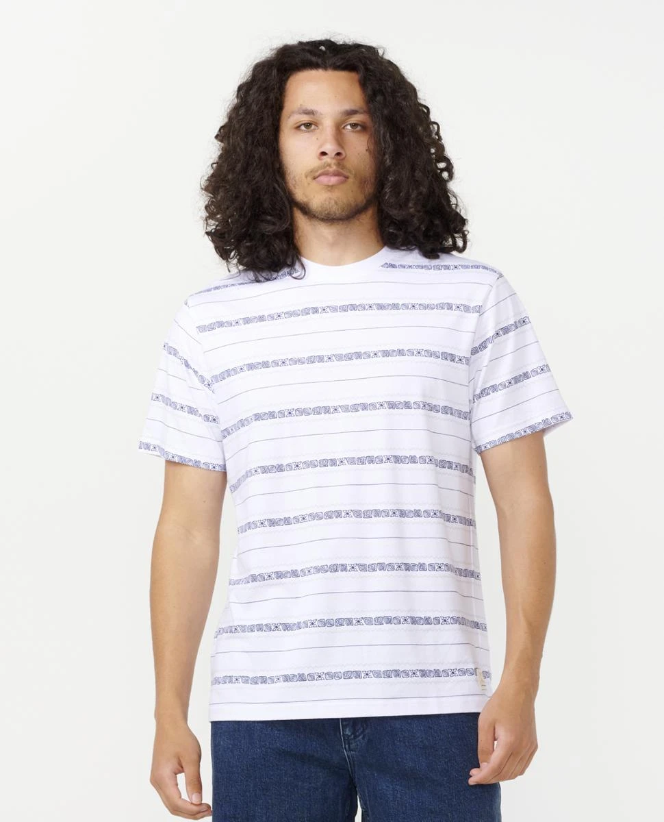The Hoffman Stripe Tee is made from 100% cotton, featuring a printed stripe design, woven label, and responsibly sourced materials.