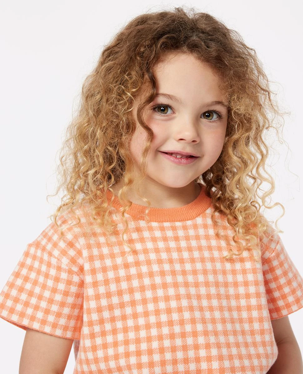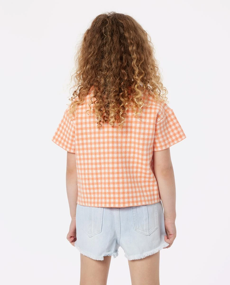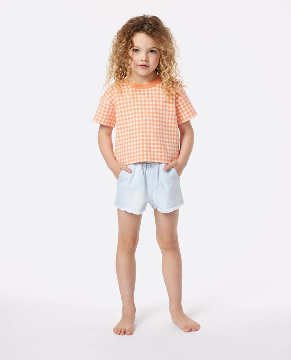 This adorable pastel orange gingham tee with a cute crop fit is perfect for playdates under the sun or layering up when the winds turn cool. It’s a must-have for every coastal girl’s closet.